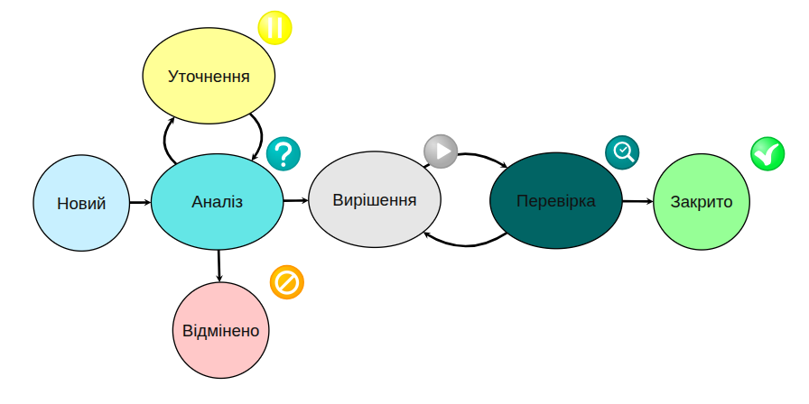 Робочій процес (Діаграма) - послідовність етапів (дій, задач, перевірок) та правил залучення фахівців та їх команд для вирішення інциденту в бажані терміни (SLA).